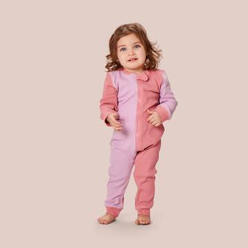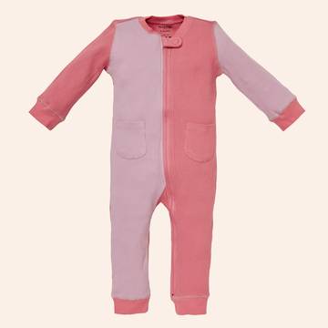 This will be your little one’s favorite outfit. It’s made in super soft textured organic cotton waffle knit fabric. Beautiful muted solids and yarn dyed stripes can be worn out and about, or comfortably to naptime or bedtime. A full length zipper closure makes dressing easy. Patch pockets come in handy and our YD logo is embroidered at the sleeve.