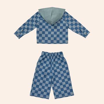 The Check Denim Jacket has a zip front closure and a knit french terry hood and pockets. The matching pants are modeled after our best-selling style ever, the Bolinas pants, in this super cool denim check. Streetwear fit - check.