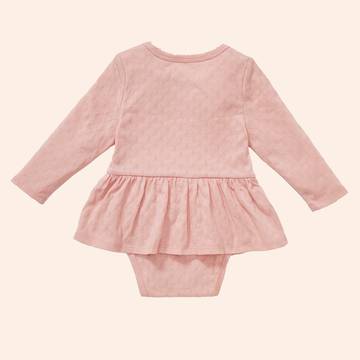 Made in adorable organic cotton pointelle, this is your sweetest elevated onesie.  Cut like your basic onesie, it features a perfectly cut ruffled skirt for a slightly more elevated basic garment.  It also features a sweet scalloped trim at the neck and yoke.