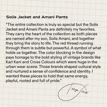 "The entire collection is truly so special but the Solis jacket and the Amani pants are definitely my favorites. They carry the heart of the collection as both pieces are named after my son, Solis Amani, and together they bring the story to life. A read thread running through them is subtle but powerful. A symbol of what holds us together. The color blocking in the design pays homage to the bold styling of vintage brands that shaped cultural style and nurtured a sense of confidence and identity. I wanted these pieces to hold the same energy - playful, rooted, and full of pride." - Leeza Joneé