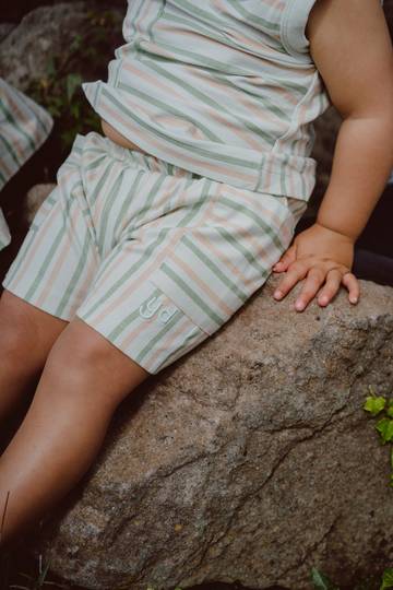 Colorblocking is a science and an art form and we've taken it to the next level with stripe blocking. These shorts are an easy summer staple with a comfy elastic waist and side seam patch pockets that hold all the seashells and all the snacks.
